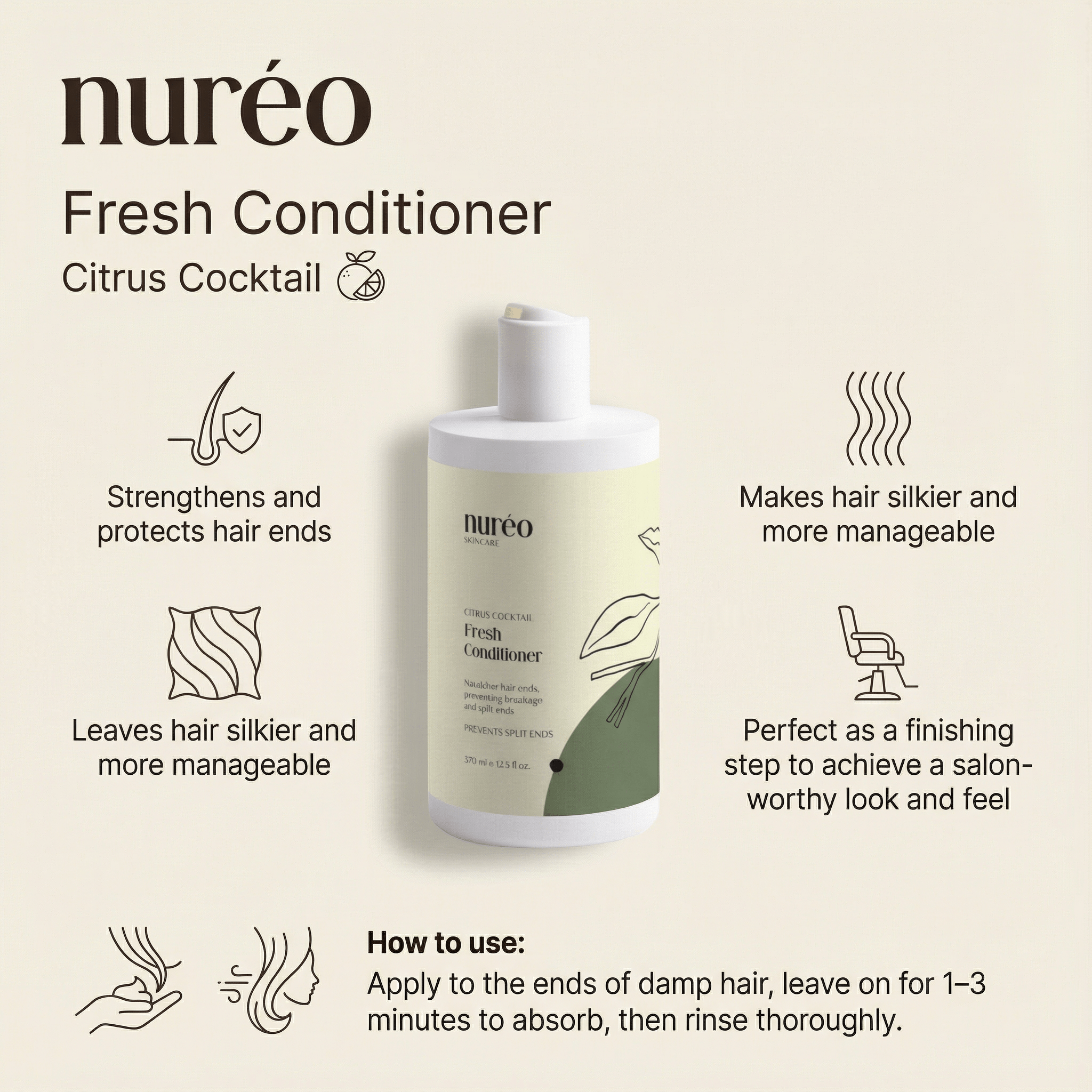 How to use: Apply to the ends of damp hair, leave on for 1–3 minutes to absorb, then rinse thoroughly.
